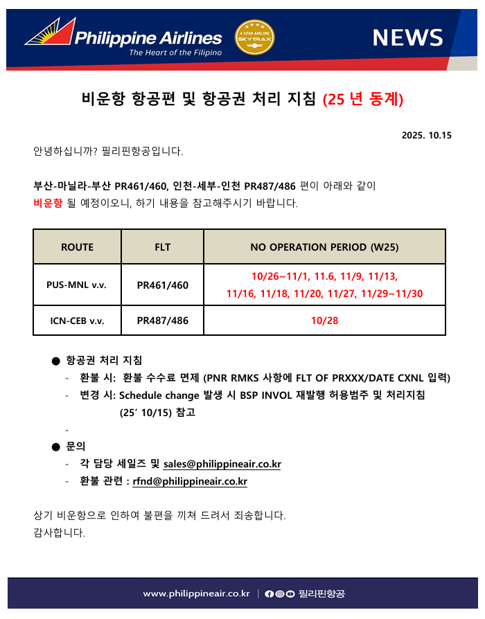 [필리핀항공] 비운항 항공편 및 항공권 처리 지침 (25년 동계)