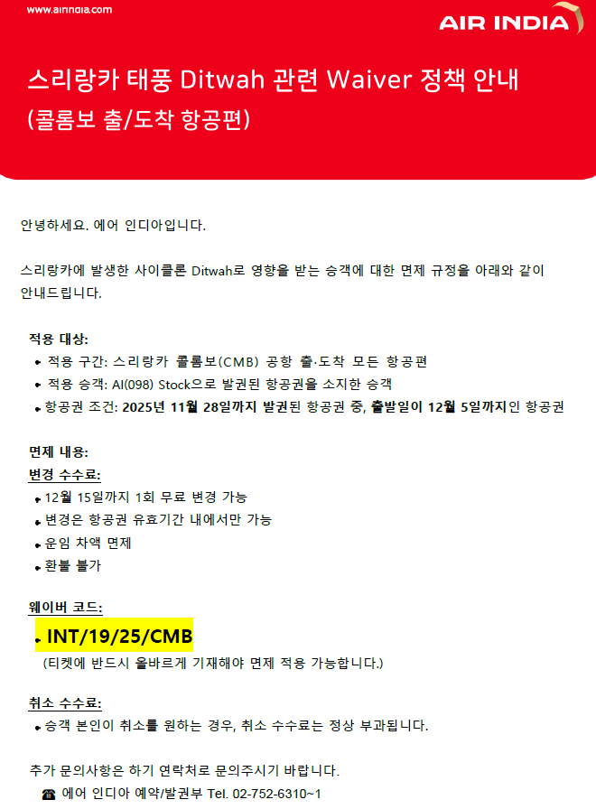[에어 인디아] 스리랑카 태풍 디트와 관련 웨이버 정책 안내