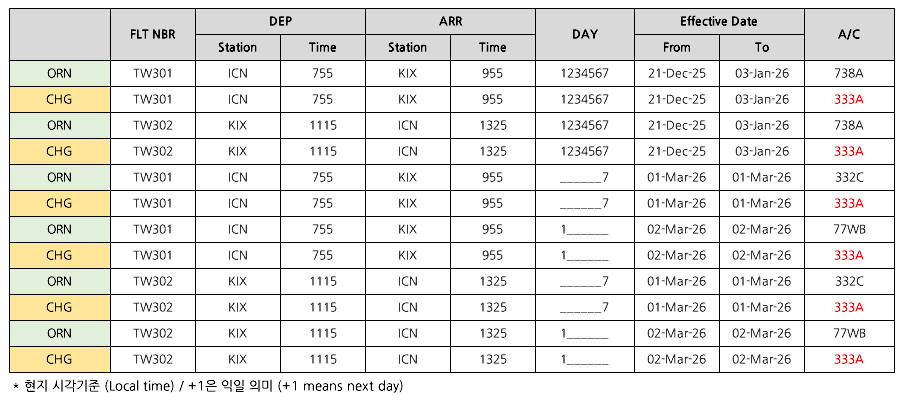 [REACCOM] 12/21~03/02 ICN/KIX V.V 기종 변경