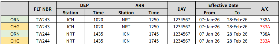 [REACCOM] 01/07~02/28 ICN/NRT V.V 기종 변경