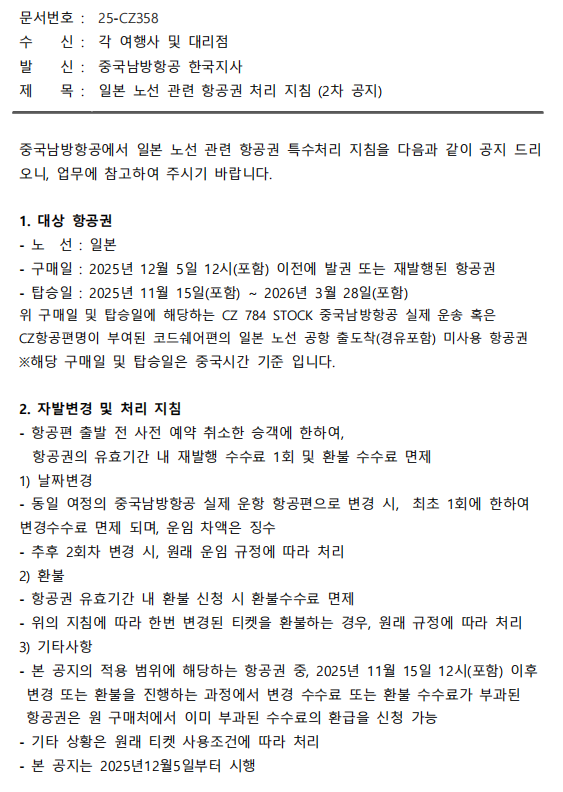 중국남방항공 일본 노선 항공권 처리 지침(2차 공지)