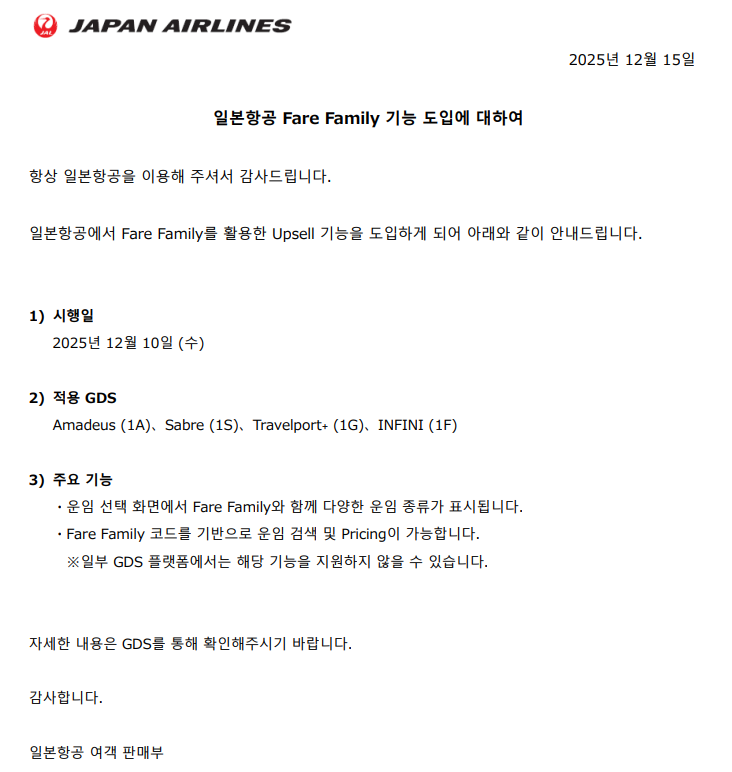 각 GDS를 통해 해당 기능 확인 후 저희 일본항공 판매에 참고해주시면 감사하겠습니다.