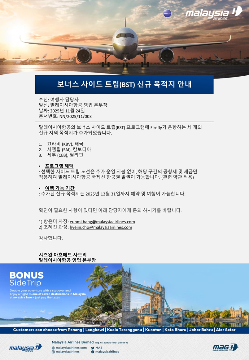 ---------------------- 안녕하세요, 쿠알라룸푸르에서 경유하여 말레이시아 이외의 목적지로 여행하는 경우, 경유하는 기간 내에 말레이시아 국내 목적지까지의 왕복 항공권을 무료로 즐기실 수 있는 말레이시아항공의 BST (BONUS SIDE TRIP) 관련하여 업데이트 드립니다. 2023년 12월 1일부로, 이용 가능한 목적지에 MYY/KCH/SBW/BTU가 제외됩니다. 하기 내용 참고 부탁 드립니다. - 판매: 2022년 5월 23일 - 추후 공지일까지 - 여행: 2022년 5월 23일 - 추후 공지일까지 * BST 국내선 목적지: LGK/PEN/AOR/JHB/KBR/TGG/KUA * BST 적용 항공권: 왕복/편도 항공권에서 모두 이용 가능 * BST 적용 횟수: Inbound/Outbound 중 1회 사용 * BST 적용 국제선 목적지: MH가 운항하는 모든 목적지 * BST 해당 요금: 비즈니스/이코노미Flex/이코노미Basic (LITE와 결합 불가) * BST 이용 가능 항공편: MH가 운항하는 MH 항공편 (코드쉐어 이용 불가) BST를 이용 시, KUL에서의 Stopover는 불가합니다. 감사합니다. 말레이시아항공 한국지사 ===============================