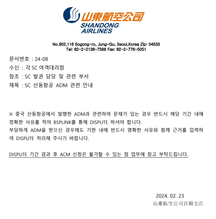 공문24-08 SC 산동항공 ADM 관련 안내.doc