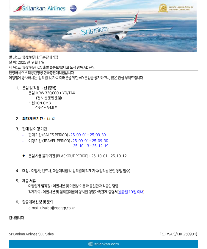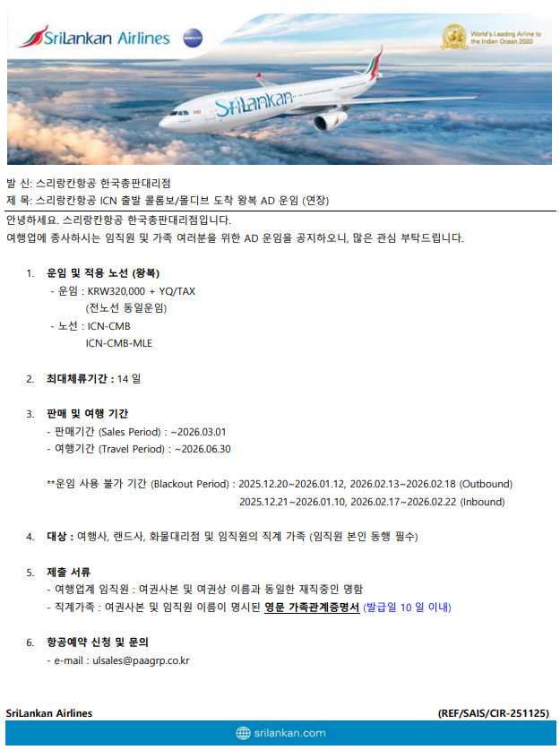 [스리랑칸항공] 항공업계 임직원 및 가족 AD운임 출시 (연장)