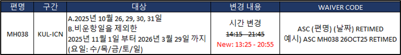 말레이시아항공 정규 운항 일정에 변동이 있어 안내드립니다. 웨이버 코드를 참고하시어 공지된 항공권 처리 규정을 확인해 주시기 바랍니다. 1. 변경 내용
