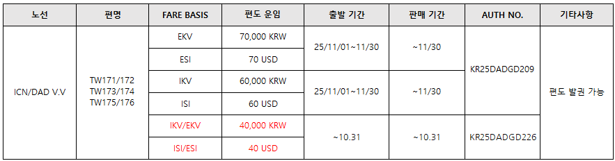 행복을 나르는 티웨이항공에서 다음과 같이 ICN/DAD 노선의 E,I CLS 특가를 안내드리오니 업무에 참고하시기 바랍니다. - 다 음 - 1. 노선별 판매 운임