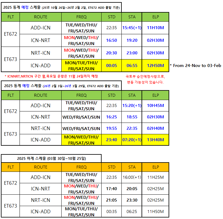 (2025.11.19) 2025-11-24 일부터 2026-02-03 일까지, ET673 ICN-ADD 편 도착예정시간이 업데이트 되었습니다. ================================================================================================ 안녕하십니까, 에티오피아 항공입니다. 25년 동계기간(10월 26일 - 26년 3월 29일) 운항 예정인 에티오피아 항공 인천공항 출도착 항공편의 운항 시간 정보를 안내드립니다. * 국토부 승인 예정사항으로, 변동 가능성이 있습니다. 25년 10월 26일 아디스아바바 출발 ET672편부터 적용 예정으로, 10월 27일 인천-나리타구간 ET672,ET673편과 10월 28일 아디스아바바 행 ET673편부터 적용 예정입니다. 2025-11-24 일부터 2026-02-03 일까지, 아디스아바바 행 ET673편 도착예정시간이 업데이트 되었습니다. 아디스아바바 기준 26년 2월 3일부터의 운항 예정 스케줄에도 조정이 있을 예정입니다. 인천 기준 2월 4일부터 출발하는 아디스아바바 행 ET673 편부터는 자정 이전으로 출발 시간을 앞당겨 운항될 예정입니다. 항공편 이용시 참고 부탁드립니다. 상세한 세부 운항 예정 스케줄은 아래의 표를 참고 부탁드립니다. 감사합니다.