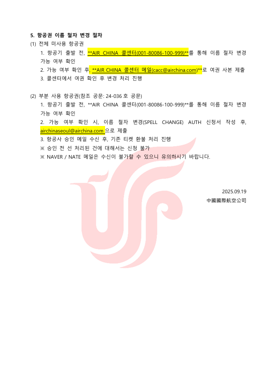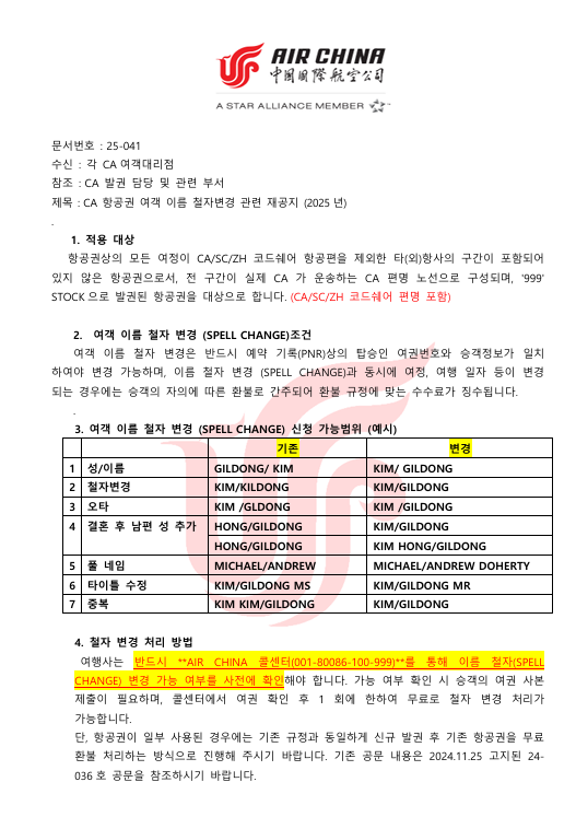 CA 항공권 여객 이름 철자변경(SPELL CHANGE) 작업에 관한 규범 재공지(2025.09.19)