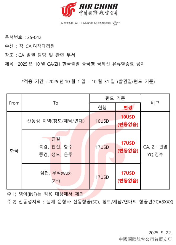 2025년 10월 CA,ZH 한국출발 중국행 국제선 유류할증료 공지