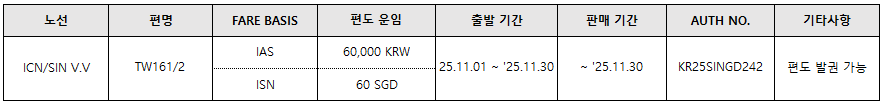 행복을 나르는 티웨이항공에서 다음과 같이 ICN/SIN 노선의 I CLS 특가를 안내드리오니 업무에 참고하시기 바랍니다. - 다 음 - 1. 노선별 판매 운임