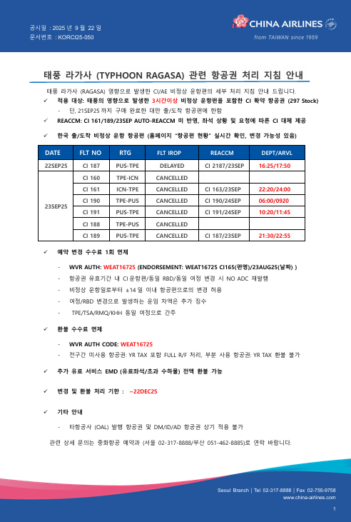 태풍 라가사 (Typhoon RAGASA) 관련 CI 항공권 처리 지침 안내 (22SEP25~)