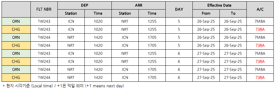 [REACCOM] 9/26~9/27 ICN/NRT V.V 기종 변경