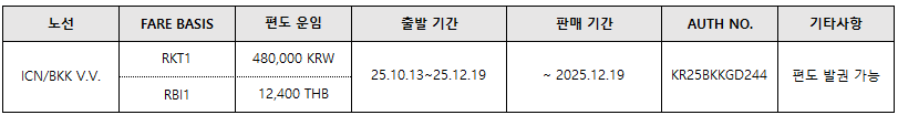 행복을 나르는 티웨이항공에서 다음과 같이 ICN/BKK 노선의 R CLS 특가 안내드리오니 업무에 참고하시기 바랍니다. - 다 음 - 1. 노선별 판매 운임  2. 주의 사항 가. R CLS로 운임 Quotation 적용 // WP로 Quotation 가능 나. Combination : 모든 INDIV Class와 결합 가능 다. R CLASS는 BUSINESS FARE로 F/C/R CLASS와 모든 세부 RULE동일하며 RD으로 조회 가능 라. CHILD 할인 불가 마. IN/OUT 각각 다른 AUTH NO.에 해당하는 경우 O/B 기준으로 AUTH NO. 기입 바. 자동발권으로 개런티된 운임 사용 시 AUTH NO (TOURCODE) 입력 불요 매뉴얼 발권 시 Tour Code 입력란에 AUTH NO. 입력 필수 auth No. 오입력/미입력 시 ADM FEE 및 해당 노선의 C CLS와의 차액 징수 감사합니다. |