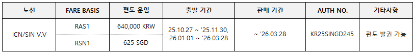행복을 나르는 티웨이항공에서 다음과 같이 ICN/SIN 노선의 R CLS 특가 안내드리오니 업무에 참고하시기 바랍니다. - 다 음 - 1. 노선별 판매 운임  2. 주의 사항 가. R CLS로 운임 Quotation 적용 // WP로 Quotation 가능 나. Combination : 모든 INDIV Class와 결합 가능 다. R CLASS는 BUSINESS FARE로 F/C/R CLASS와 모든 세부 RULE동일하며 RD으로 조회 가능 라. CHILD 할인 불가 마. IN/OUT 각각 다른 AUTH NO.에 해당하는 경우 O/B 기준으로 AUTH NO. 기입 바. 자동발권으로 개런티된 운임 사용 시 AUTH NO (TOURCODE) 입력 불요 매뉴얼 발권 시 Tour Code 입력란에 AUTH NO. 입력 필수 auth No. 오입력/미입력 시 ADM FEE 및 해당 노선의 C CLS와의 차액 징수 감사합니다. |