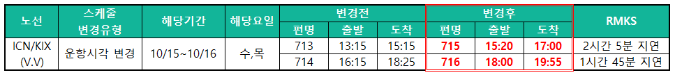 안녕하십니까, 에어서울입니다. 하기와 같이 25/10/15(수) ~ 25/10/16(목) KIX노선 RS713/714편 SKD CHNG에 따른 PENALTY WVR 지침을 공지드리오니, 각 담당자께서는 참고하여 적의 조치하여 주시기 바랍니다.