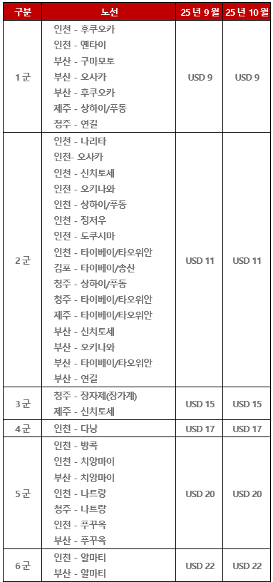 안녕하십니까, 이스타항공 입니다. 이스타항공에서 한국발 국제선 유류할증료를 다음과 같이 안내하여 드립니다. - 다 음 - 1. 적용일: 2025년 10월 1일 ~ 9월 31일 (편도 / 발권일기준) 2. 유류할증료 ( 한국발 유류할증료 )