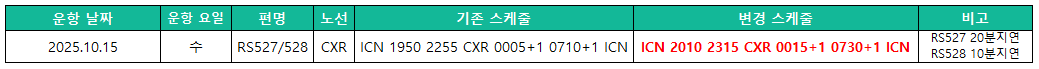[공지] '25/10/15(수) CXR노선 RS527/528편 SKD CHNG에 따른 PENALTY WVR 지침