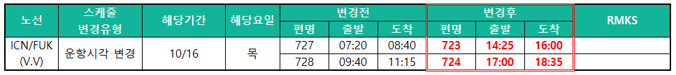 안녕하십니까, 에어서울입니다. 하기와 같이 25/10/16(목) FUK노선 RS727/728편 SKD CHNG에 따른 PENALTY WVR 지침을 공지드리오니, 각 담당자께서는 참고하여 적의 조치하여 주시기 바랍니다.