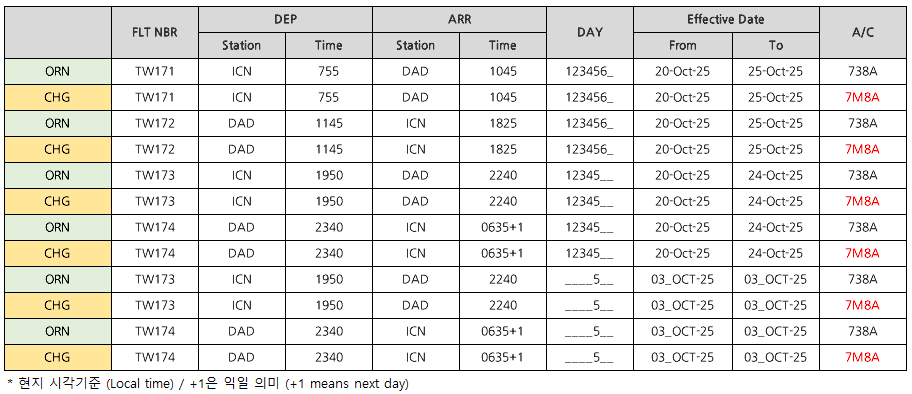 [REACCOM] 10/03~10/25 ICN/DAD V.V 기종 변경
