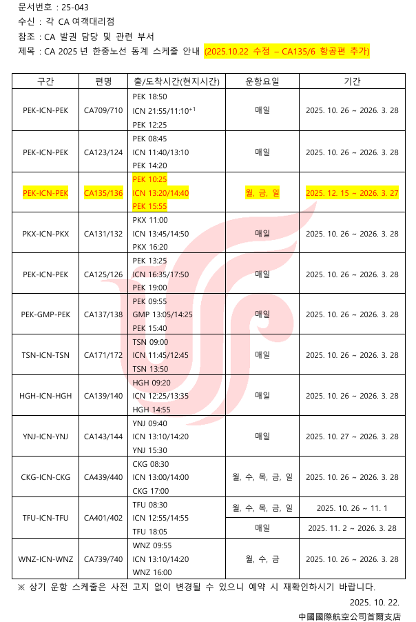 CA 2025 한중노선 동계 스케줄 안내 - 251022 수정