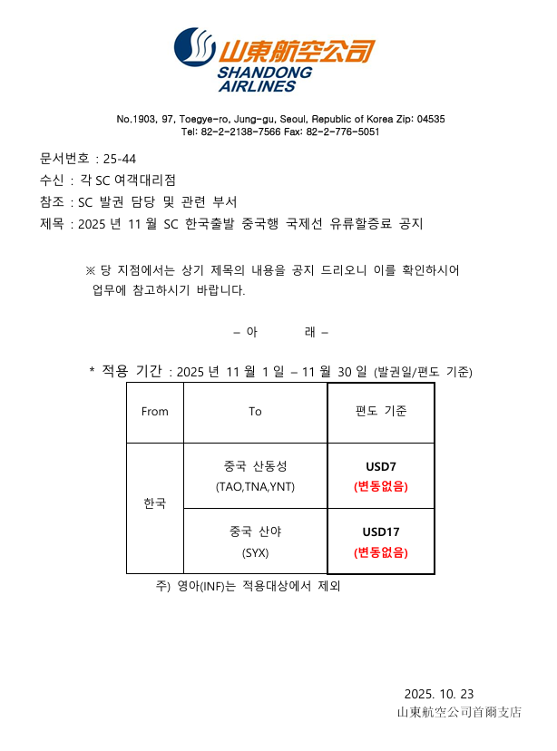 2025년 11월 SC 한국출발 중국행 국제선 유류할증료 공지