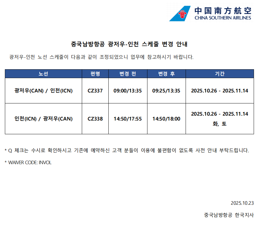 중국남방항공 광저우-인천 스케줄 변경 안내 ( 2025.10.23 )