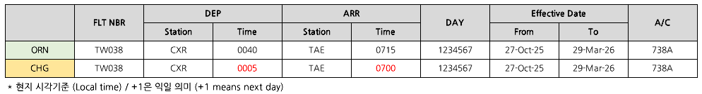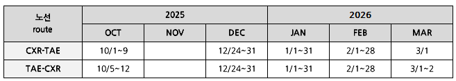 [REACCOM] 10/27~03/29 CXR/TAE 운항시간 변경 및 항공권 처리 안내