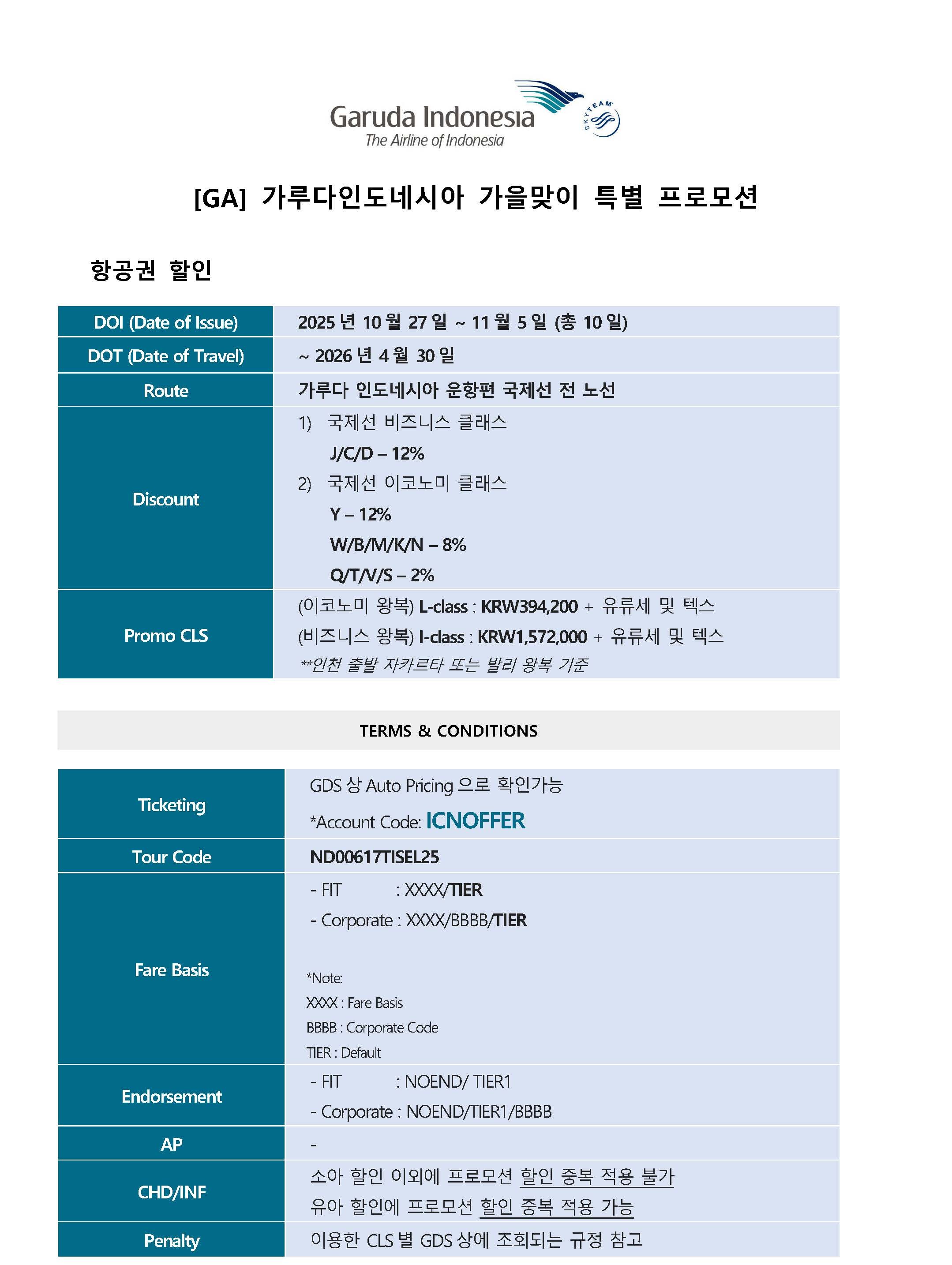 안녕하세요. 가루다인도네시아입니다. 가루다항공에서는 가을을 맞아 전 여행사 대상으로 프로모션을 진행합니다. 아래 내용과 첨부파일 확인하셔서 특가 기간 동안 많은 판매될 수 있도록 도움 부탁드립니다. 감사합니다.