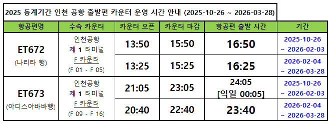 안녕하십니까, 에티오피아 항공입니다. 2025년 동계 기간[2025년 10월 25일-2026년 3월 28일 까지] 동안 의, 에티오피아 항공의 인천 공항 출발 항공편 [인천-아디스아바바, 인천-나리타] 카운터 운영시간을 안내 드립니다. 동계기간 카운터 운영시간에 약간의 차이가 있으니, 실제 이용일의 카운터 운영시간을 확인하여 탑승수속 및 항공편 이용을 당부드립니다. ==================================================================