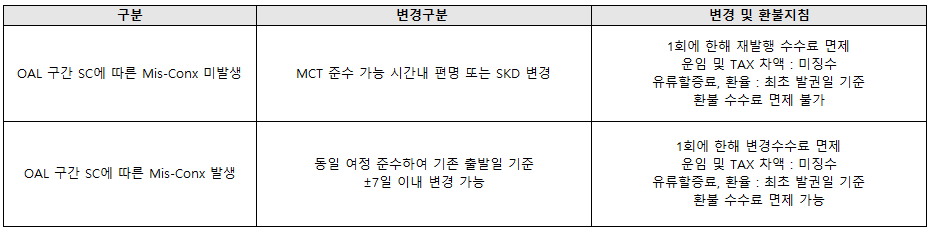 3. 공통 처리 절차  ① TW구간 ORGN Booking Class 및 Fare Basis 유지하되 잔여석이 없는 경우 상위 CLS 변경 가능  ② OAL 구간 AVAIL한 CLS 중 가장 하위 CLS로 변경  ③ 발권처에서 직접 재발행 또는 환불 처리          - 변경 AUTH : AL25ALLDC109 (Tour Code Box에 기입)         - 환불 AUTH : AL25ALLRF109  (Waiver Code Box에 기입)   ④ REACCOM FLT와의 연결 여정이 있는 경우 MCT, 환승 조건 확인 및 조정  ⑤ 구간변경 불가   4. 기타 참고사항   * 48시간 이내 발생한 OAL 구간 SC의 경우 OAL이 REISSUE원칙이나 발권처에서 직접 재발행 시 아래 절차 준수  ① TW구간 ORGN Booking Class 및 Fare Basis 유지하되 잔여석이 없는 경우 상위 CLS 변경 가능  ② OAL 구간 AVAIL한 CLS 중 가장 하위 CLS로 변경  ③ 상위 CLS로 변경 시에도 NO-ADC 재발행 처리 (fare discount 처리 불요)  ④ 발권처에서 직접 재발행 또는 환불 처리 : 포괄 AUTH 입력         - 변경 AUTH : AL25ALLDC109 (Tour Code Box에 기입)         - 환불 AUTH : AL25ALLRF109  (Waiver Code Box에 기입)   ⑤ Ticket Endorsement Box : INVOL 입력 (INVOL 미입력시 ADM 처리)  ⑥ REACCOM FLT와의 연결 여정이 있는 경우 MCT, 환승 조건 확인 및 조정  ⑦ 구간변경 불가