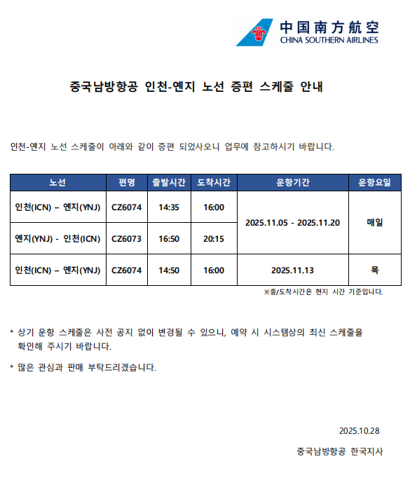 CZ 인천-옌지 노선 증편 스케줄 안내 (25.10.28).pdf