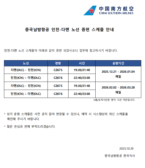 CZ 인천-다롄 노선 증편 스케줄 안내 (25.10.29).pdf