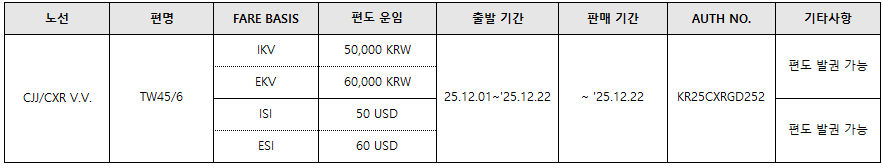 행복을 나르는 티웨이항공에서 다음과 같이 CJJ/CXR 노선의 E,I CLS 특가를 안내드리오니 업무에 참고하시기 바랍니다.                                                                                    - 다 음 -   1. 노선별 판매 운임