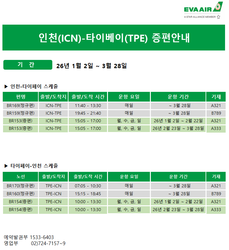 [에바항공] 인천-타이베이 노선 BR153/BR154 증편 운항 안내 ( ~28MAR'26)