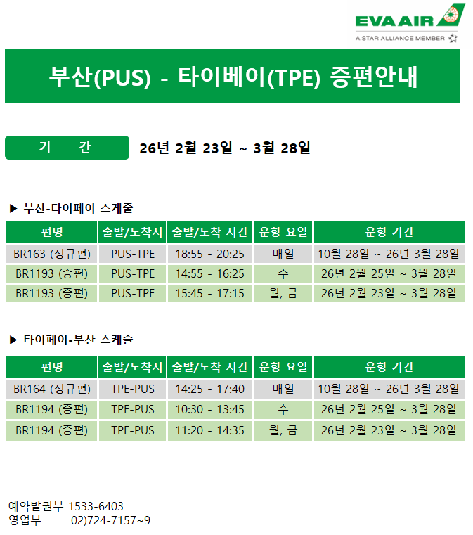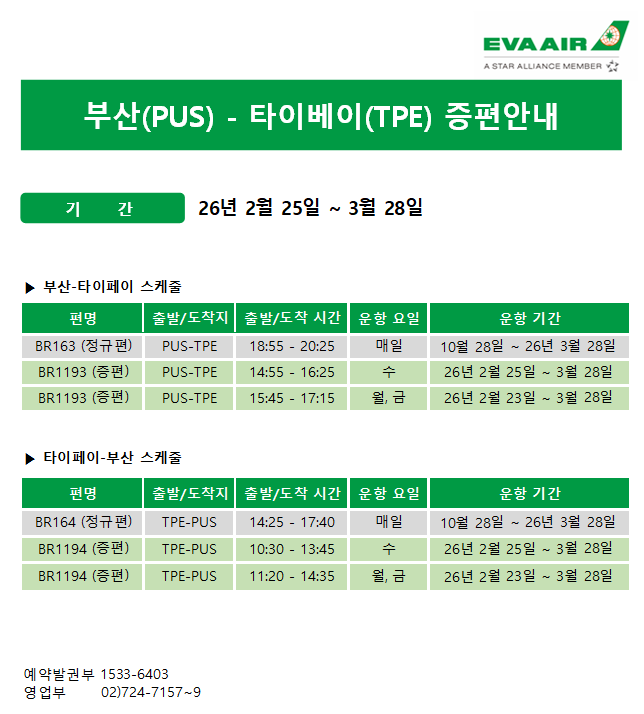 [에바항공] 부산-타이베이 노선 증편 운항 안내