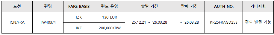 행복을 나르는 티웨이항공에서 다음과 같이  ICN/FRA 노선의 I CLS 특가를 안내드리오니 업무에 참고하시기 바랍니다.                                                              -                다              음            -    1. 노선별 판매 운임
