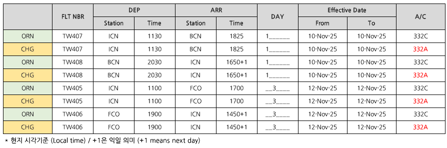 [REACCOM] 11/10~11/12 ICN/FCO, BCN V.V 기종 변경