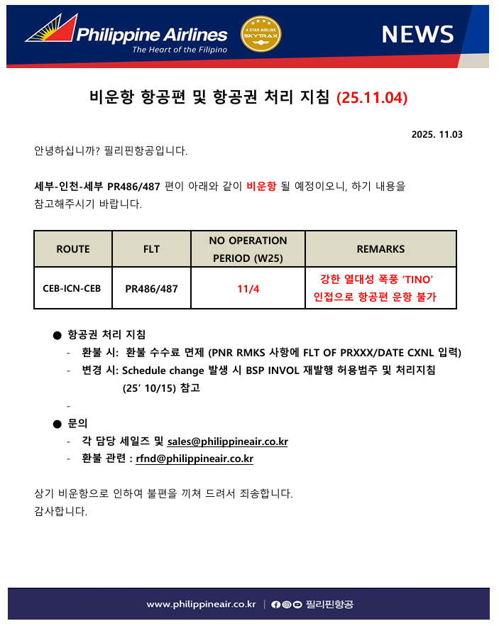 [필리핀항공] 비운항 항공편 및 항공권 처리 지침 (세부_25.11.04)
