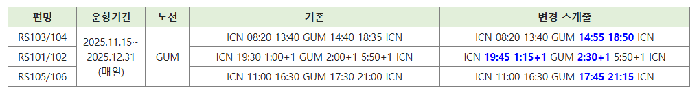 안녕하십니까, 에어서울입니다. 하기와 같이 ''25/11/15(토)~''25/12/31(수) GUM노선 RS101/102/104/106편 SKD CHNG에 따른 PENALTY WVR 지침을 공지드리오니, 각 담당자께서는 참고하여 적의 조치하여 주시기 바랍니다.
