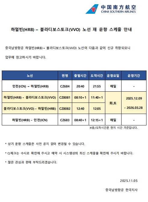 하얼빈(HRB) - 블라디보스토크(VVO) 노선 재 운항 스케줄 안내