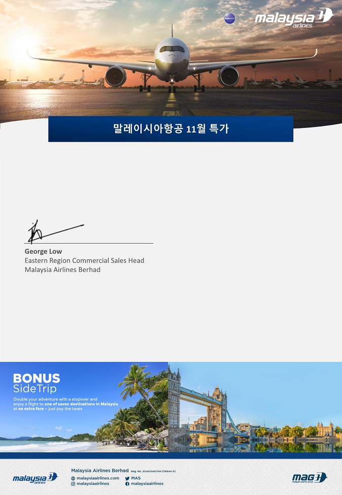 말레이시아항공 11월 특가의 발권일이 연장됩니다.