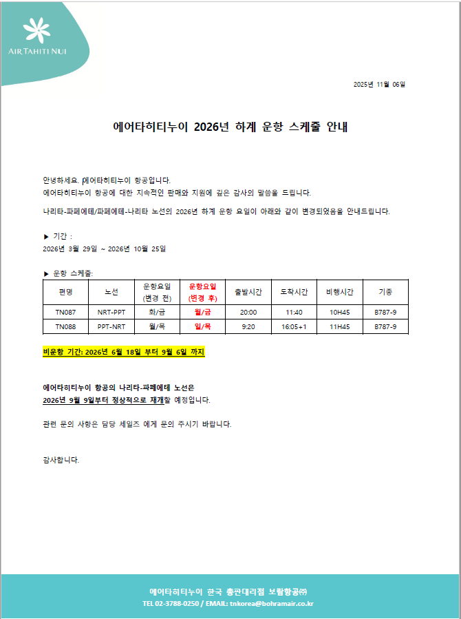 [TN_에어타히티누이] 26년 NRT-PPT 하계 운항 스케줄 변경 안내
