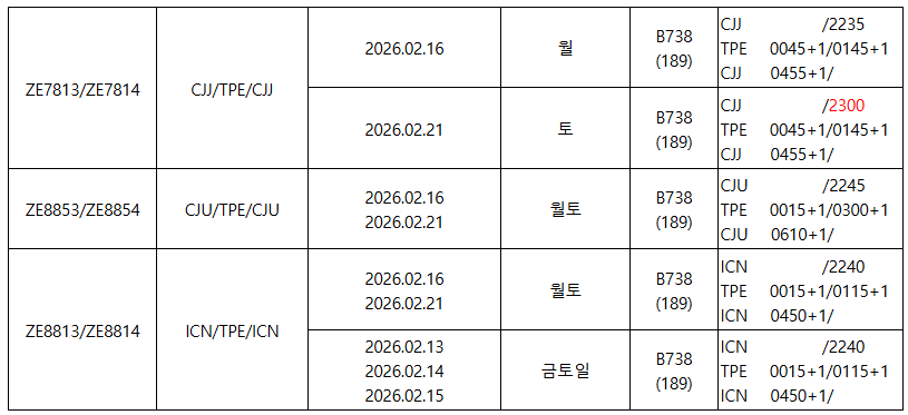 아래와 같이 2026년 2월 타이페이 노선 증편기 스케줄 오픈을 안내드립니다.