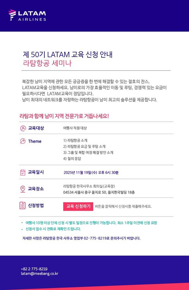 남미 최대의 네트워크를 자랑하는 라탐항공이 인커밍 세미나를 진행합니다. 남미로의 가장 효율적인 이동 및 루팅, 경쟁력 있는 요금이 필요하시다면 LATAM 세미나를 신청하세요. - 대상 : 여행사 직원 대상 - 일시 : 2025년 11월 19일 (수) 오후 6시 30분 - 장소 : 라탐항공 한국사무소 (서울시 중구 을지로 50, 을지한국빌딩 18층) - 신청 방법 : 신청하기 링크 (해당 신청하기 링크를 클릭 후 신청 진행) * 선착순 8명 마감으로, 참여를 원하실 시 빠른 신청 부탁 드립니다.