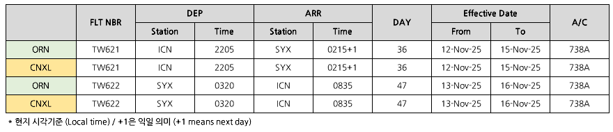 안녕하십니까.행복을 나르는 티웨이항공에서 비운항에 대하여 다음과 같이 안내드리오니 해당 건에 대한 PNR 확인 부탁드립니다.We would like to inform you of the following flight cancellation, and ask you to check your PNR for this case
