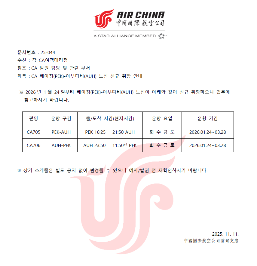 CA 베이징(PEK)-아부다비(AUH) 노선 신규 취항 안내