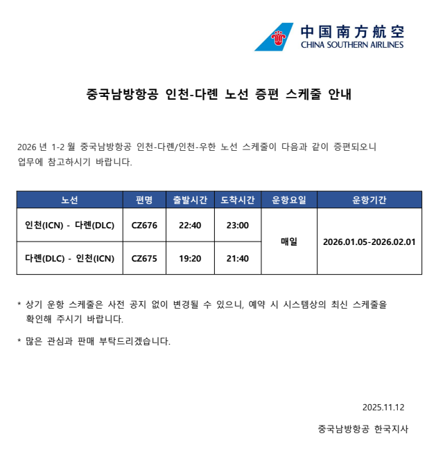 중국남방항공 인천-다롄 노선 증편 스케줄 안내 (25.11.12).pdf