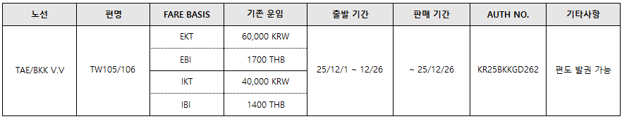 행복을 나르는 티웨이항공에서 다음과 같이 TAE/BKK 노선의 I, E CLS 특가를 안내드리오니 업무에 참고하시기 바랍니다. - 다 음 - 1. 노선별 판매 운임