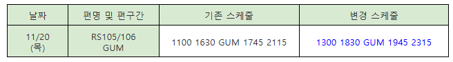 안녕하십니까, 에어서울입니다. 하기와 같이 25/11/20(목) GUM노선 RS105/106편 SKD CHNG에 따른 PENALTY WVR 지침을 공지드리오니, 각 담당자께서는 참고하여 적의 조치하여 주시기 바랍니다.